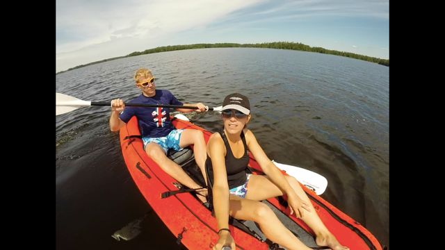 After refusing the offer of an electric pump from our friendly neighbour ‘nope, we need to get the hang of this thanks!’, we got the boat inflated, the seats strapped in and were all set to go. Or so we thought. Once out on the lake I found that the seating position at the front was far from comfortable, my feet were higher than my bum and I had no way of using my feet to brace myself as I paddled with the result that my legs started to ache. I’d just about resigned myself to the fact that this kayak was crap and poorly designed when we realised our mistake.